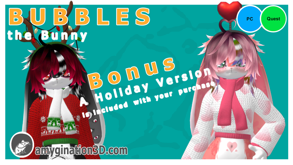 An adorable VRChat furry bunny avatar for both Quest and PC. Unity Packages with Game Ready PC and Quest versions and basic instructions how to upload.